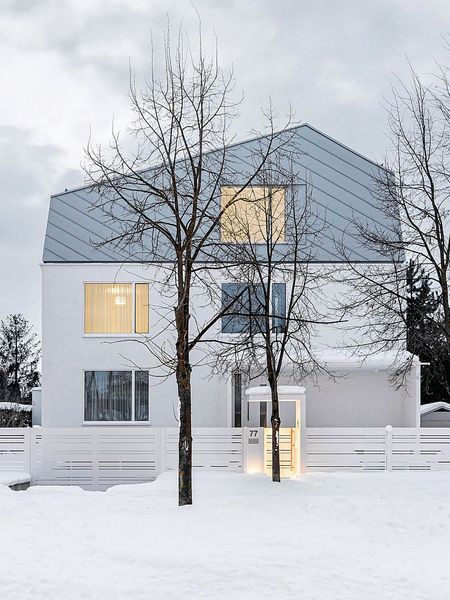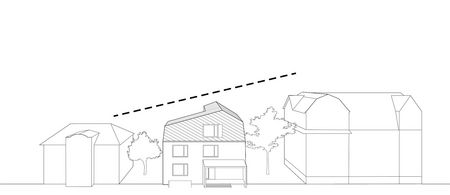 Budynek został świadomie wpisany pomiędzy dwa sąsiednie obiekty. Jeden z nich jest niższy, drugi wyższy. Linia dachu domu wynika bezpośrednio z połączenia tych dwóch wysokości, co nie jest przypadkowym formalnym gestem, ale konsekwencją szacunku do kontekstu i jednocześnie chęcią jego twórczej reinterpretacji.
