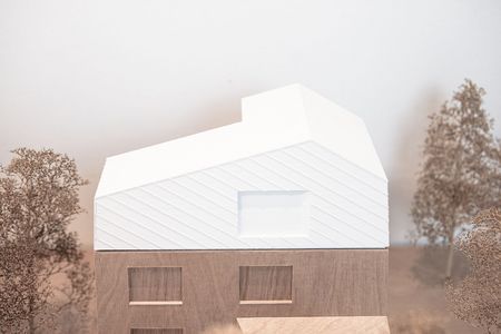 W procesie projektowym kluczowe było zrozumienie złożonej bryły. Rzut i wizualizacje komputerowe nie zawsze są intuicyjne dla inwestora, szczególnie gdy mówimy o tak mocno kształtowanej formie dachu. Dlatego przygotowano fizyczną makietę domu. Pozwoliła ona inwestorowi łatwiej odczytać relacje wysokościowe między niższą i wyższą zabudową sąsiednią a bryłą domu, umożliwiła analizę proporcji metalowej czapki względem białej bryły oraz stała się narzędziem do dyskusji o detalach wejścia, okien i kształcie dachu.