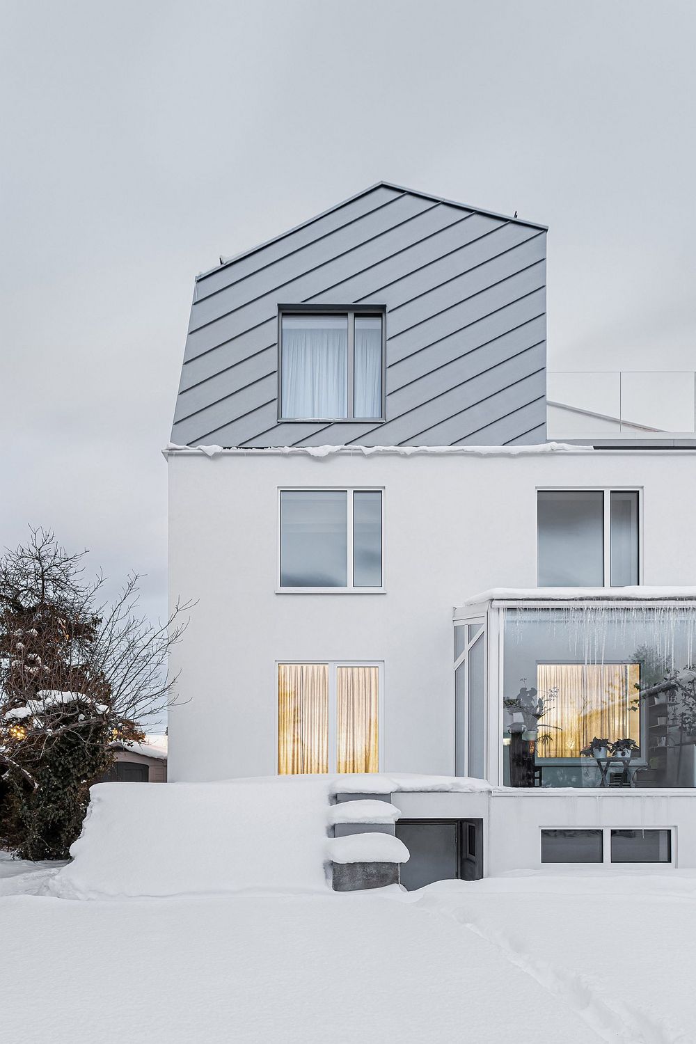 Najbardziej rozpoznawalnym elementem jest metalowa nadbudowa z blachy tytanowo–cynkowej, która została nałożona na budynek niczym wyrazisty, ale dopasowany kapelusz. Pełni ona kilka ról jednocześnie: optycznie zmniejsza bryłę domu, nadając jej lepsze proporcje, stanowi współczesną interpretację dachu mansardowego oraz spaja rozbudowaną formę przebudowywanej kostki w czytelną całość.