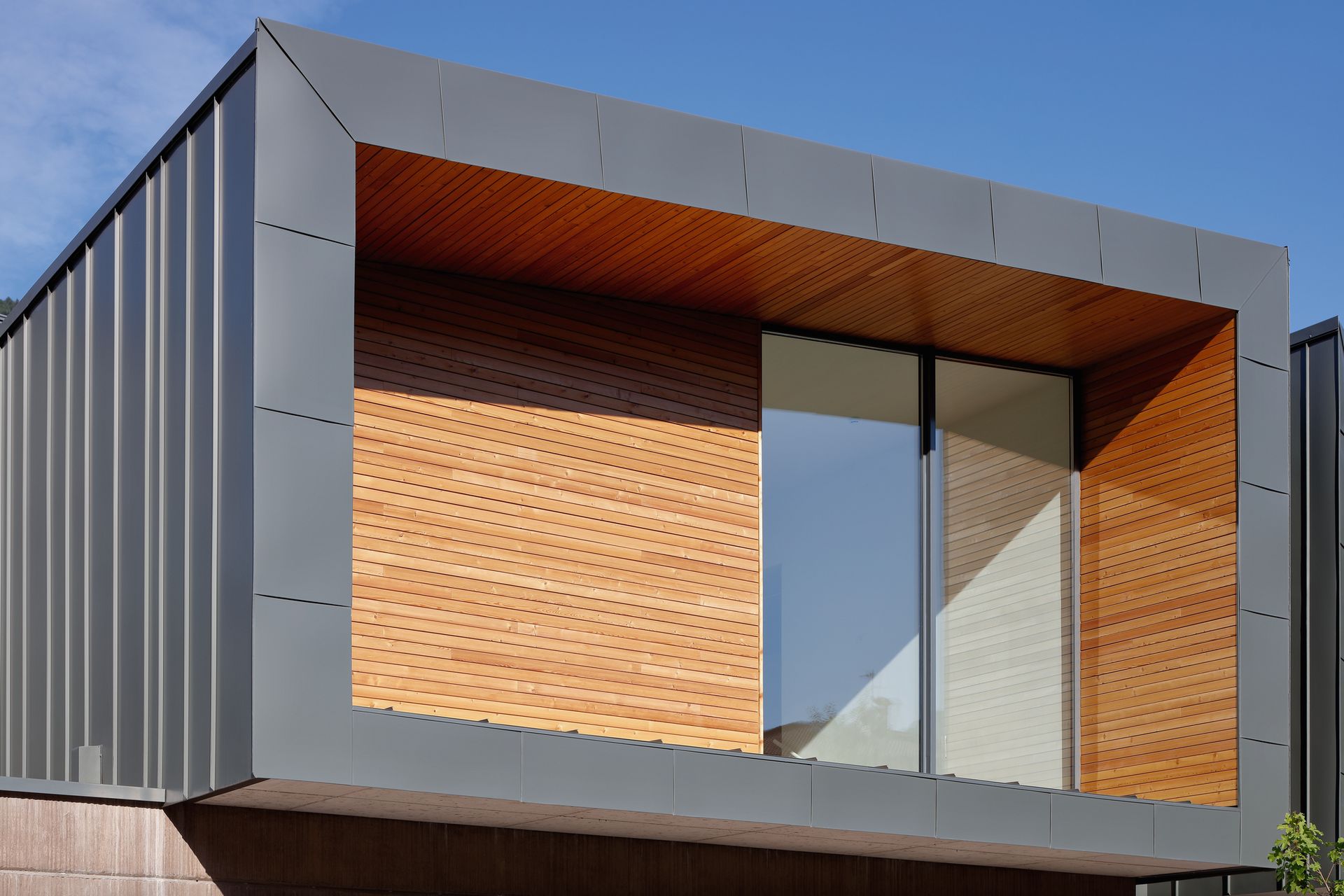 Na elewacji i dachu centrum architekci celowo wybrali tytan-cynk RHEINZINK z patynowana powierzchnią prePATINA schiefergrau nie tylko ze względu na estetykę. Trwały materiał zachwyca zrównoważonymi właściwościami, w tym najniższym śladem węglowym wśród metali, dzięki czemu idealnie wpisuje się w koncepcję projektu.