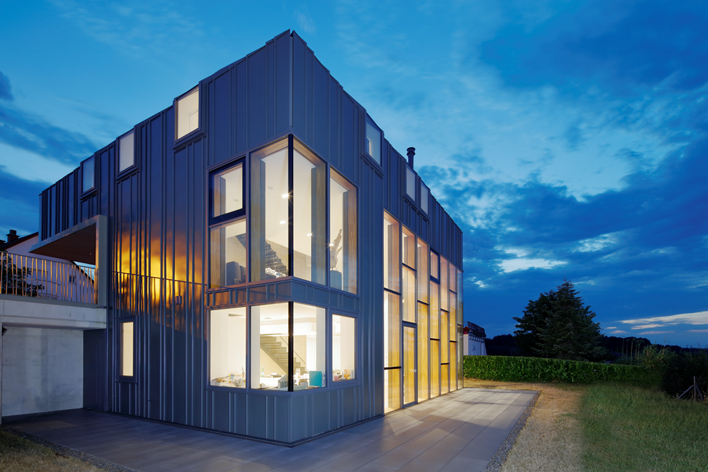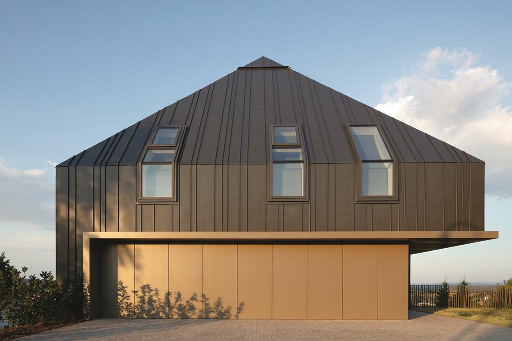Dom mieszkalny w Gonderange znajduje się na wzgórzu i wyróżnia się swoim charakterystycznym wyglądem. Elewacja i dach domu wykonane są z tego samego materiału oraz w tej samej technologii blacharskiej. Nieregularny rąbek kątowy nie tylko wizualnie wysmukla kubaturę budynku, ale łączy dach i elewację w jedną całość.