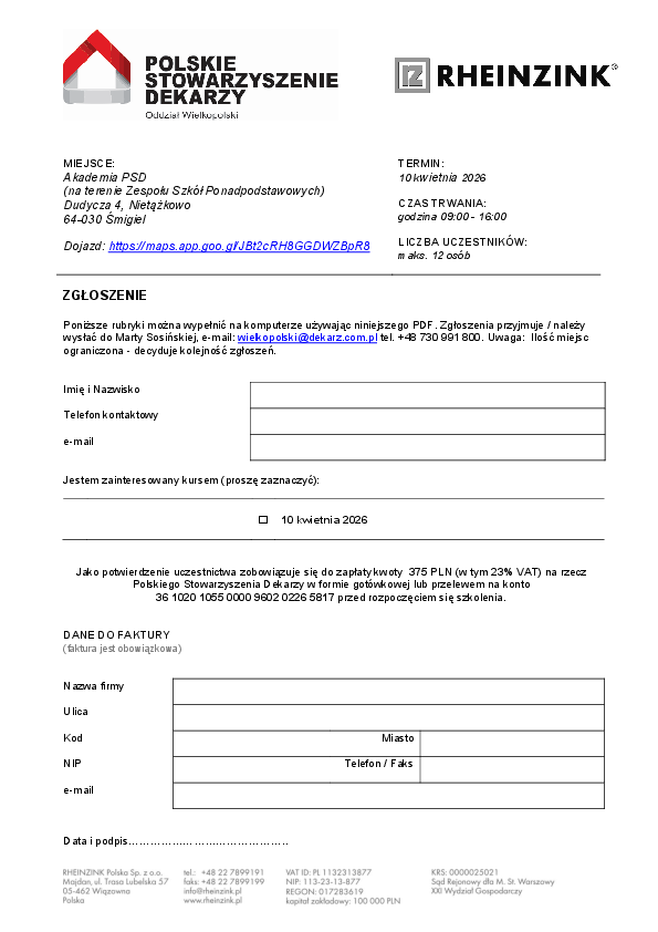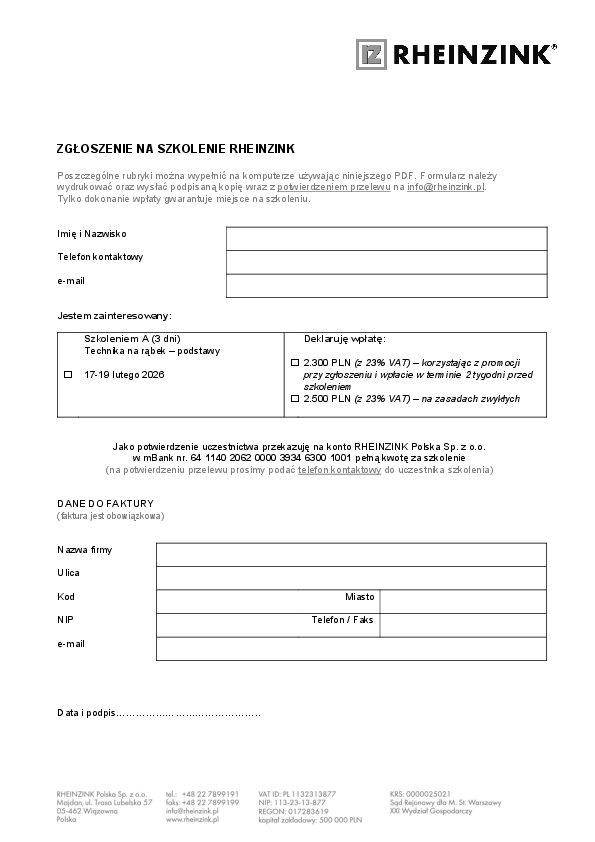 Typ wyniku Ogólny (2) Aktualności (1) Do pobrania (10) szukaj 12następny Certificate DIN EN ISO 50001 Energy Management pdf 108 KB Certificat DIN EN ISO 50001 Gestion énergétique pdf 209 KB Zertifikat DIN EN ISO 50001 Energiemanagement pdf 109 KB Zgłoszenie na szkolenie …Formularz zgłoszenia na stacjonarne szkolenia w roku 2025-2026 pdf 159 KB Nowe terminy szkoleń RHEINZINK …nie szkoleń i kursów RHEINZINK pojawiły się nowe terminy zajęć dla dekarzy i blacharzy na przełomie 2025/2026. To dobra okazja, żeby odświeżyć umiejętności lub poukładać je od podstaw – jeszcze przed kolejnym… Zgłoszenie na kurs z obróbek i lutowania Formularz zgłoszenia na kurs blacharsko-dekarski RHEINZINK "E" organizowanym we wspołpracy z PSD - Polskim Stowarzyszeniem Dekarzy / oddziałem Wielkopolskim pdf 207 KB RHEINZINK-PRISMO brushed white+ Material data sheet pdf 279 KB Zgłoszenie na szkolenie "A" Formularz zgłoszenia na stacjonarne szkolenie "A" - Technika dachów na rąbek - podstawy pdf 157 KB Zgłoszenie na szkolenie "B" Formularz zgłoszenia na stacjonarne szkolenie "B" - Zaawansowana technika dachów na rąbek pdf 156 KB RHEINZINK-PRISMO brushed white+ Materialdatenblatt pdf 277 KB 12następny